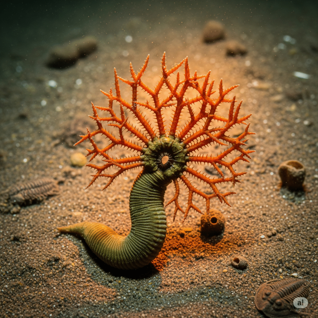 - Les mollusques à la “râpe” dentaire : Des animaux ressemblant à des limaces, dont les fossiles montrent des chaînes de dents similaires à celles des escargots modernes, utilisées pour racler les algues.